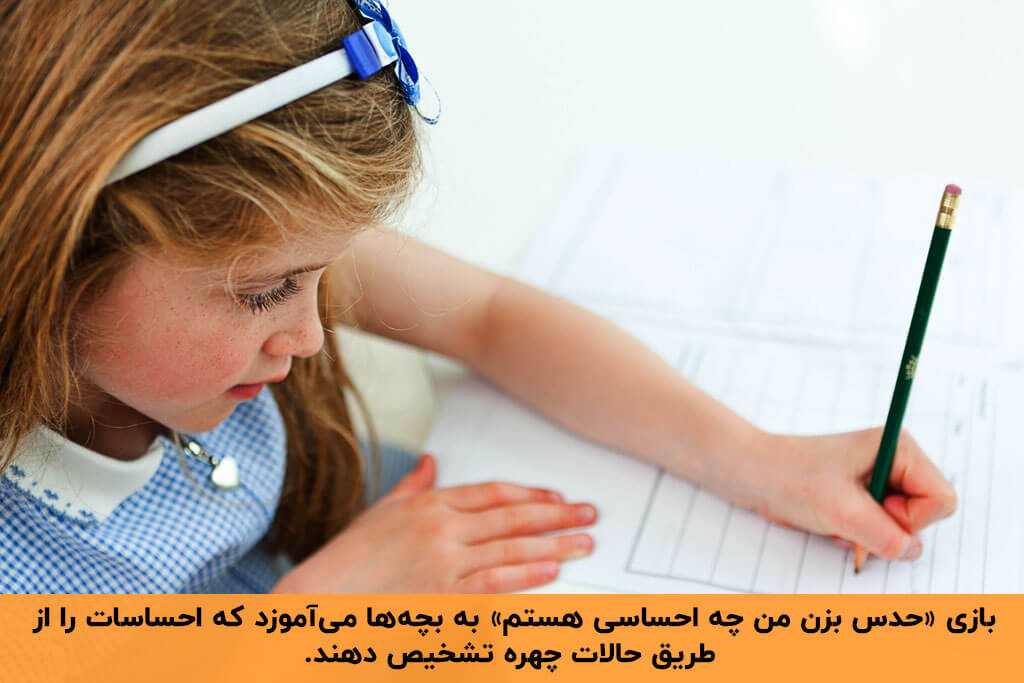 روی تعدادی کاغذ، اسم احساسات مختلف را بنویسید و آن را تا بزنید و روی میز قرار دهید. از هر کودک بخواهید تا کارتی را انتخاب کند و آن را روی پیشانی خود بچسباند. هدف این است که بقیه بازیکنان بتوانند کارت را ببینند، اما خود کودک نتواند آن را مشاهده کند. نوبت به هر بازیکن که میرسد، میتواند یک سوال در مورد کارت خود از هر نفر بپرسد، اما در این سوال نباید از اسامی احساسات واقعی استفاده کند (نگران، عصبی، متعجب). به عنوان مثال: «آیا اگر سرم را به دیوار بزنم چنین احساسی دارم؟» یا «اگر در حال باز کردن یک هدیه باشم، آیا اینطور احساس می کنم؟» سپس سایر بازیکنان پاسخ بله یا خیر خواهند داد. بازی تا زمانی ادامه مییابد که هر کارت احساسات به درستی حدس زده شود.